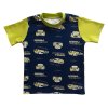 Dětské pyžamo s autíčky chlapecké skvělé pro letní noci hezky kombinuje tmavě modrou a výrazně zelenou barvu. Na horním díle je jako podklad pro jasně zelená autíčka zvolena kontrastní tmavě modrá barva. Na průkrčníku a rukávech se opakuje výrazná zelená barva. Pyžamové kalhoty jsou také zelené.