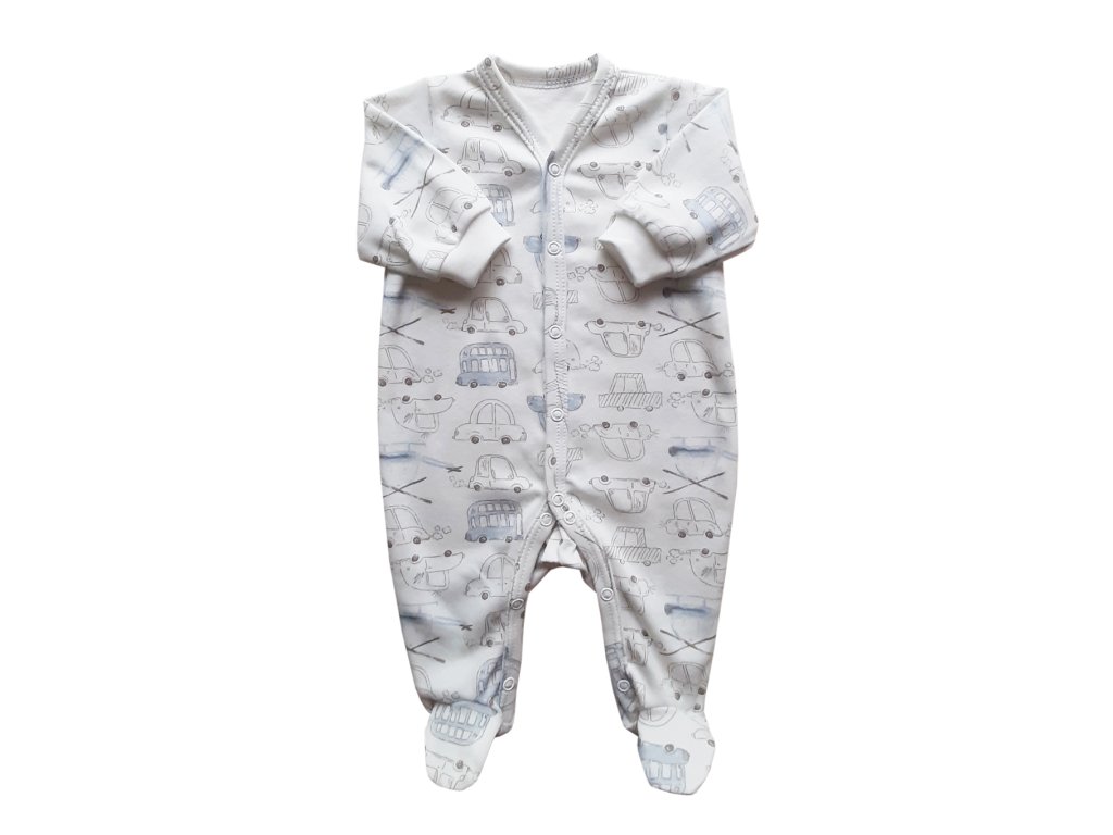 Chlapecký overal AUTA je bílý overal s potiskem lehce modrých autíček. Praktický overal ukryje bříška i zádíčka, a tak udrží děti v teple.