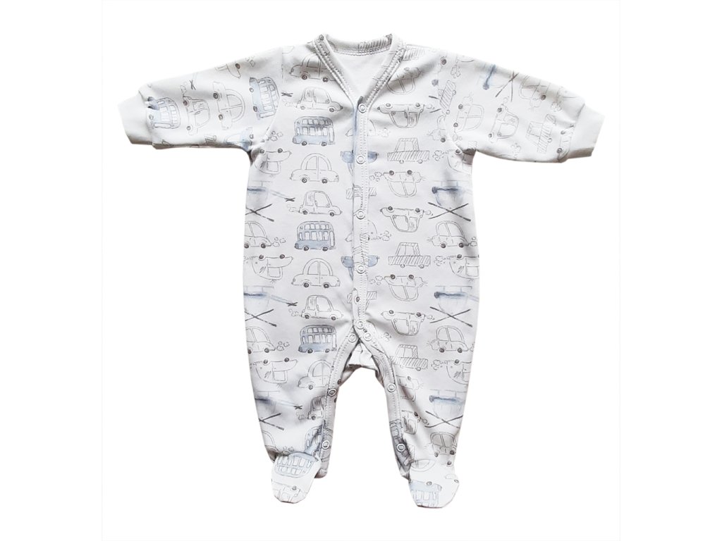 Chlapecký overal AUTA je bílý overal s potiskem lehce modrých autíček. Praktický overal ukryje bříška i zádíčka, a tak udrží děti v teple.