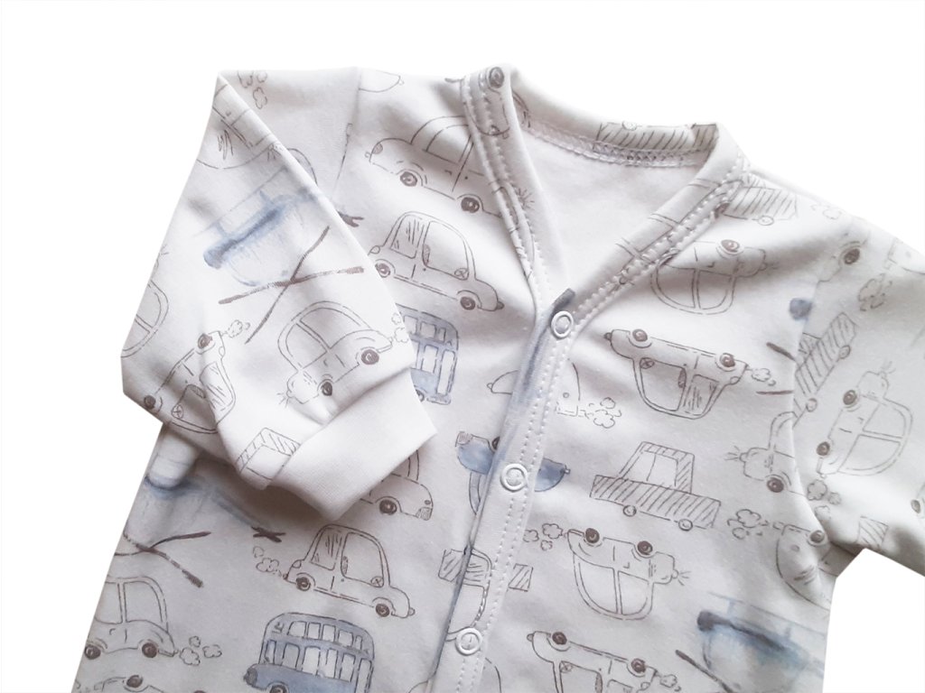 Chlapecký overal má na bílém podkladě potisk lehce modrých autíček. Šikovný overal pro kluky je celorozepínací a má dlouhé rukávy a nohavičky. Krásně měkký dětský overal jsme ušili z kvalitního bavlněného materiálu.