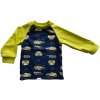 Dětské pyžamo s autíčky chlapecké hezky kombinuje tmavě modrou a výrazně zelenou barvu. Na horním díle je jako podklad pro jasně zelená autíčka zvolena kontrastní tmavě modrá barva. Na průkrčníku a rukávech se opakuje výrazná zelená barva. Pyžamové kalhoty jsou také zelené.