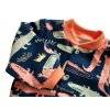 Na tmavě modrém podkladě se prochází olivově zelení a meruňkově oranžoví krokodýli. Pastelové barvy ladí s jemným oranžovým elastanem okolo krku, na koncích rukávů a spodního okraje. Výrazný pružný elastan nemá jen estetickou funkci, ale pomůže vaše děťátko udržet v teple.