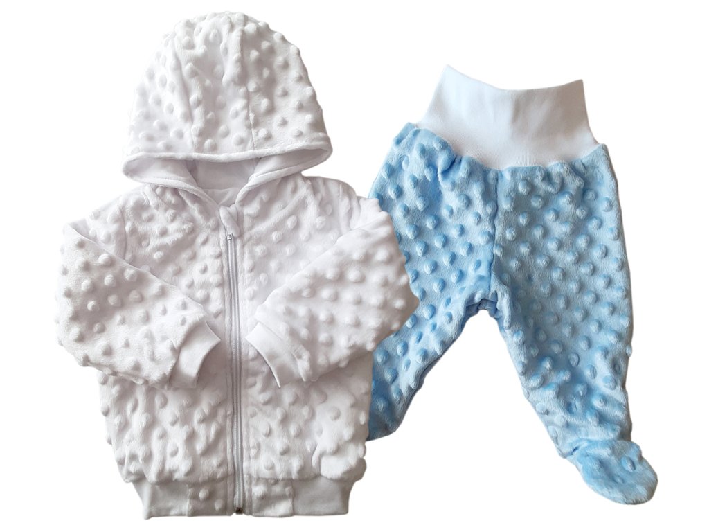 Kojenecká souprava MINKY bílo-modrá - to je chlapecká souprava pro nejmenší, která pracuje s krásnými barvami, modrou a bílou. Mikina má čistě bílou barvu, modrý nádech naleznete na polodupačkách. Jsou nebesky modré s vysokým bílým elastanem v pase.